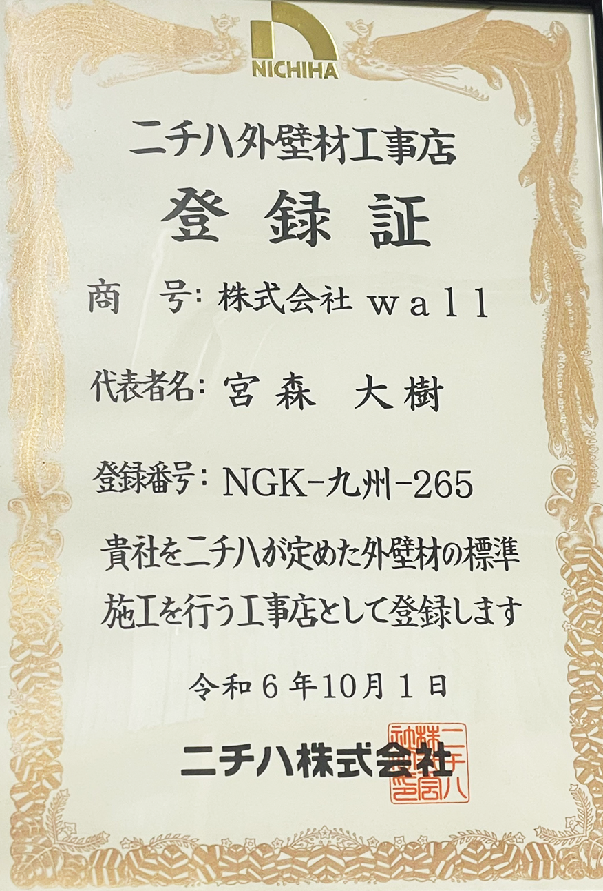 | 所有資格 | ・玉掛け技能講習 ・フルハーネス型安全帯使用作業特別教育修了 ・ニチハサイディング施工管理士認定施工店 ・ケイミュー登録施工店 |